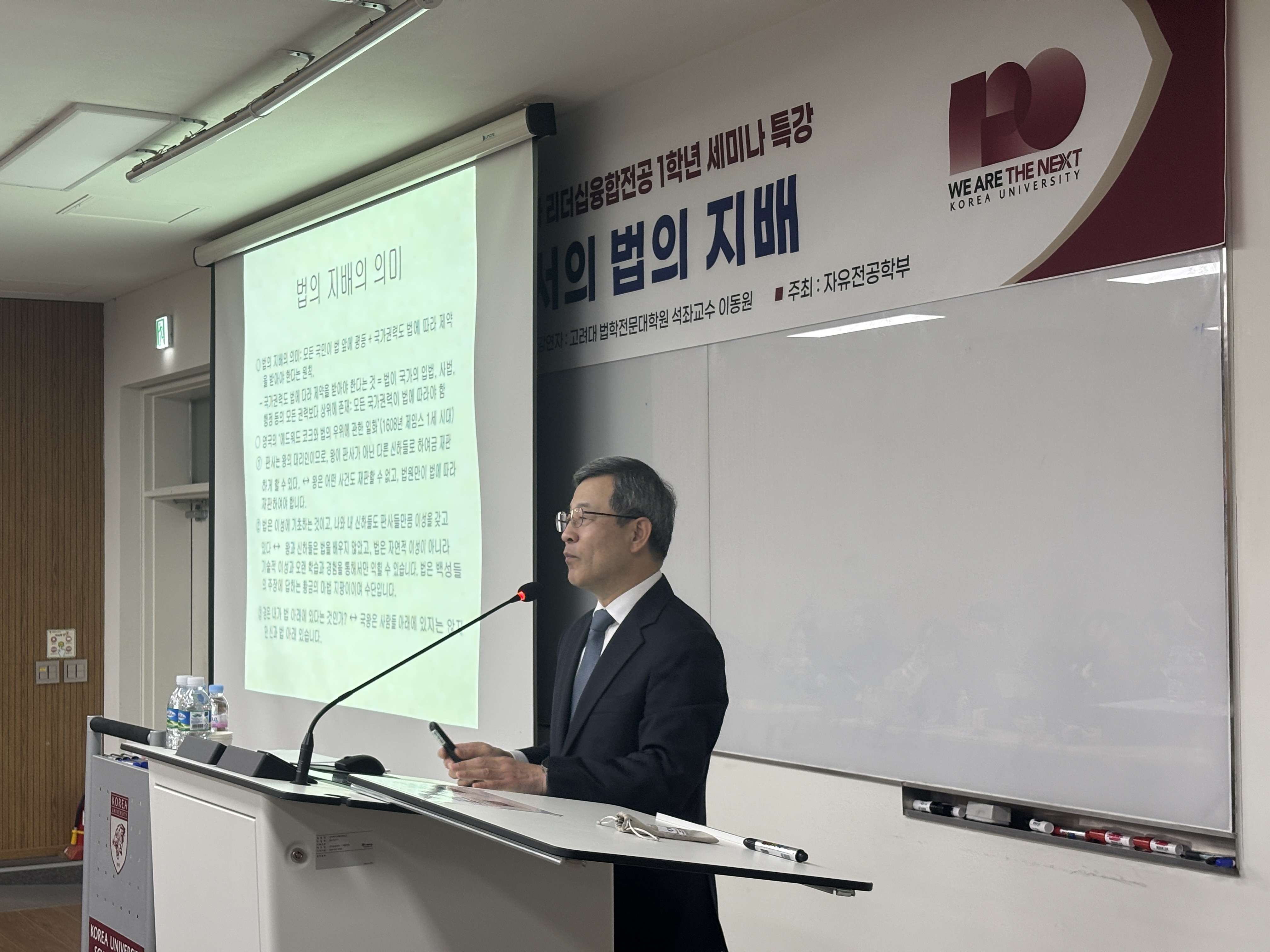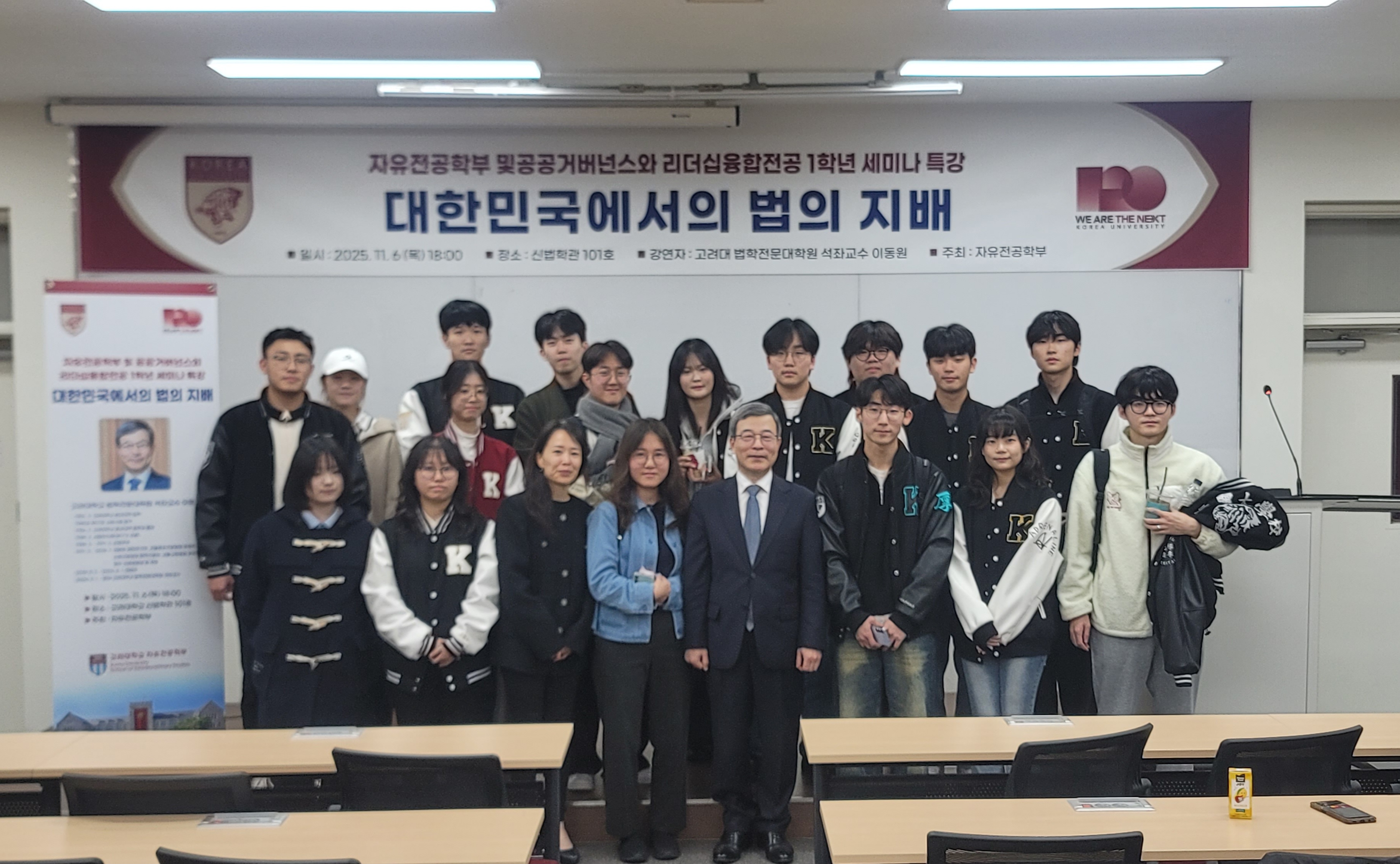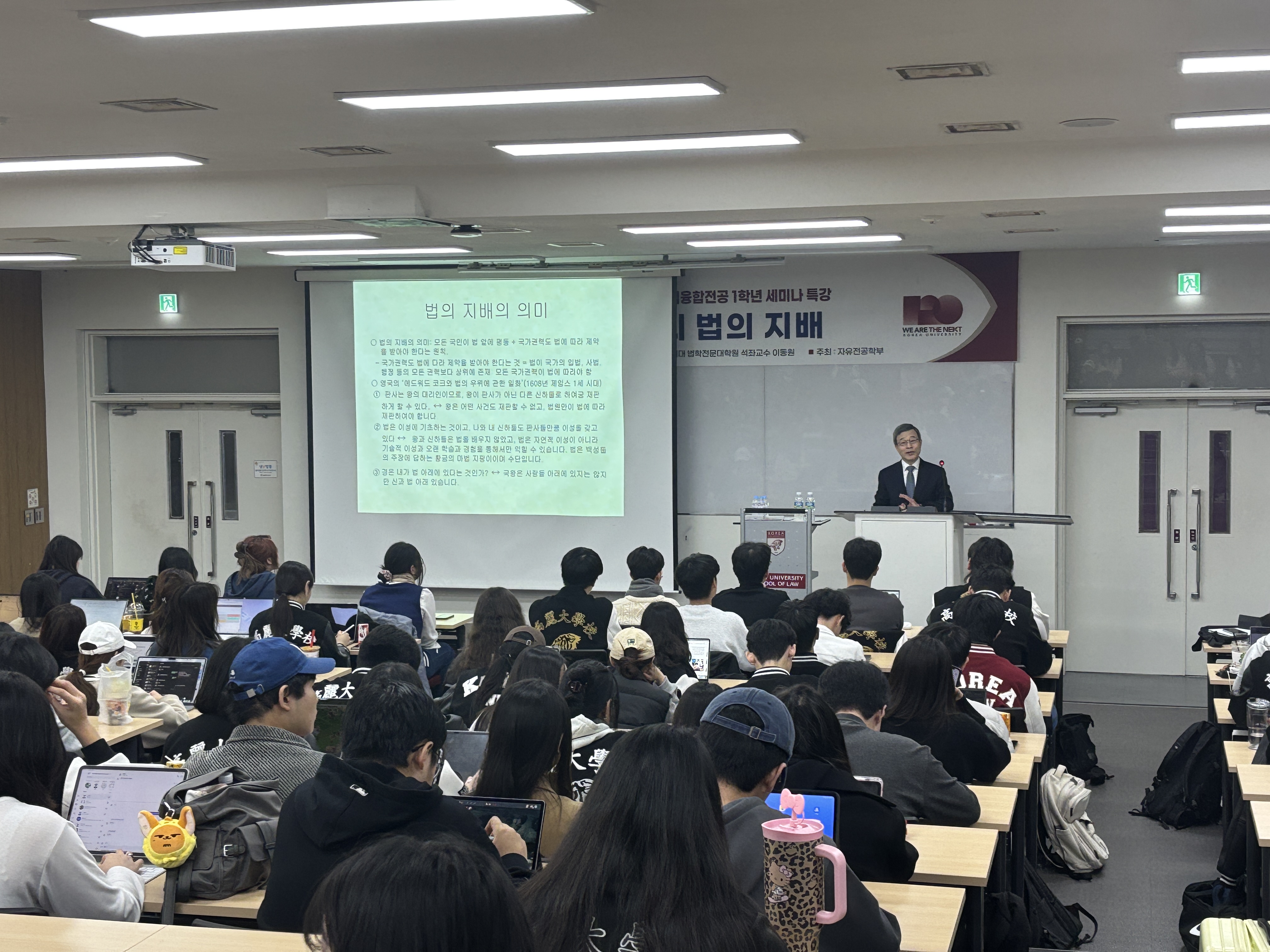 자유전공학부와 공공거버넌스·리더십융합전공은 지난 11월 6일(목) 오후 6시, 신법학관 101호에서 1학년 세미나 특강을 개최하였다. 이번 특강은 *‘대한민국에서의 법의 지배’*를 주제로 진행되었으며, 고려대학교 법학전문대학원 이동원 석좌교수님께서 강연자로 초청되어 법치주의의 본질과 중요성에 대해 강연을 펼치셨다. 이동원 석좌교수님께서는 ‘법의 지배’의 개념을 중심으로 민주주의와 법치주의의 관계를 심도 있게 설명하시며, 학생들이 법의 역할과 민주 사회의 핵심 원리를 이해할 수 있도록 이끌어주셨다. 이번 특강에는 자유전공학부 및 공공거버넌스·리더십융합전공 1학년 학생들이 다수 참여해 높은 관심을 보였으며, 강연은 성황리에 마무리되었다.